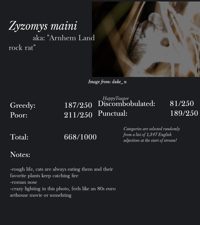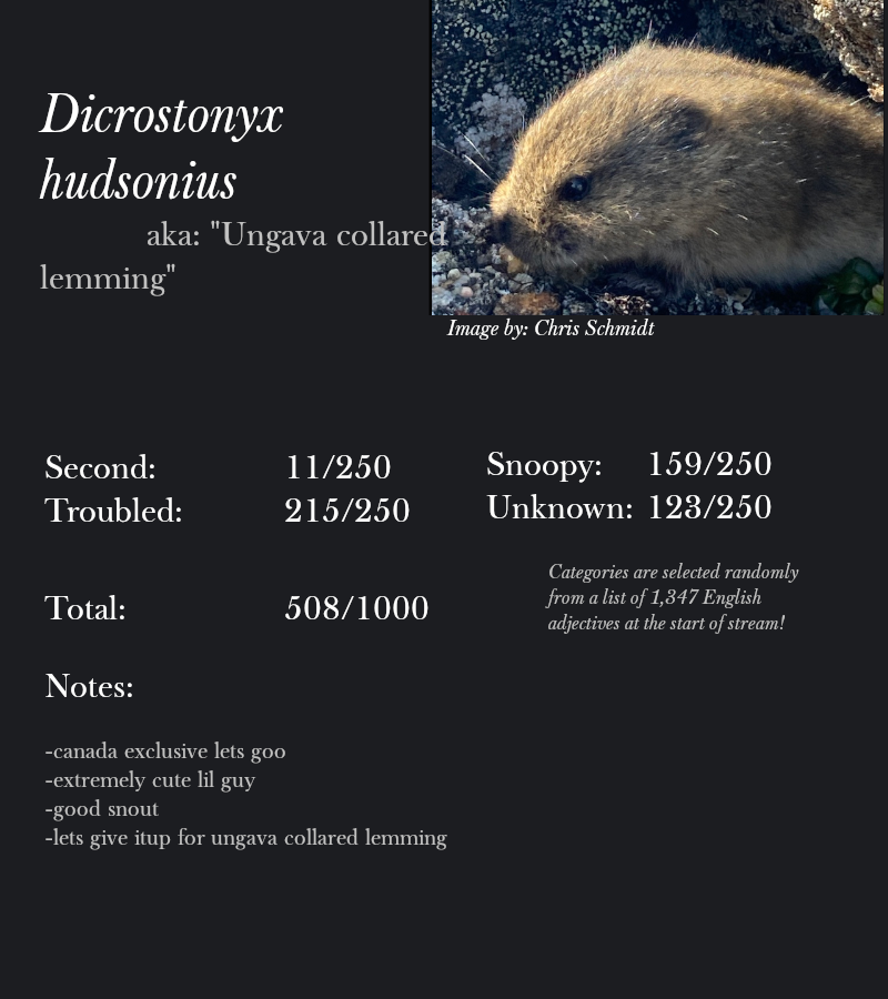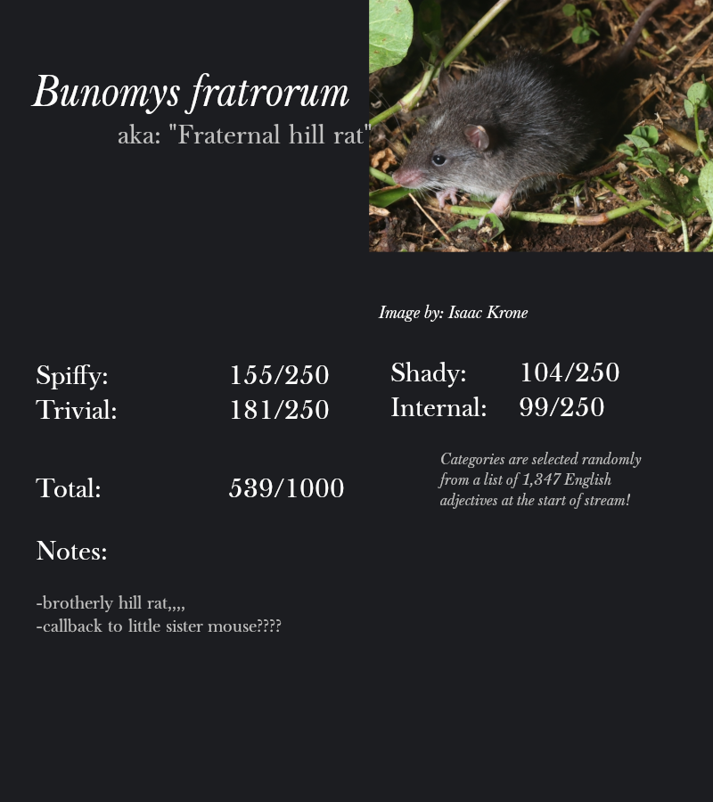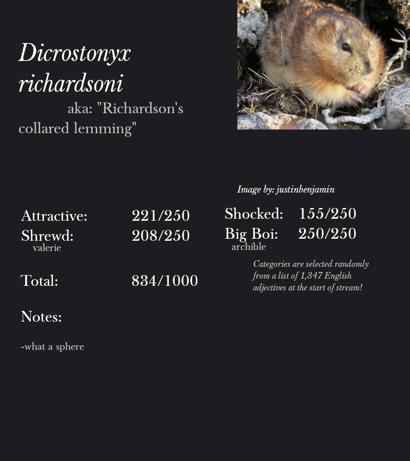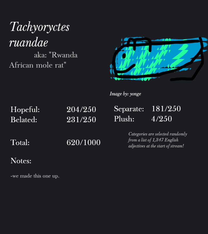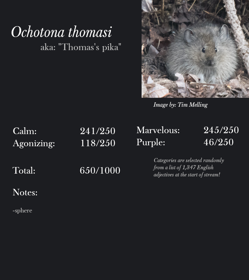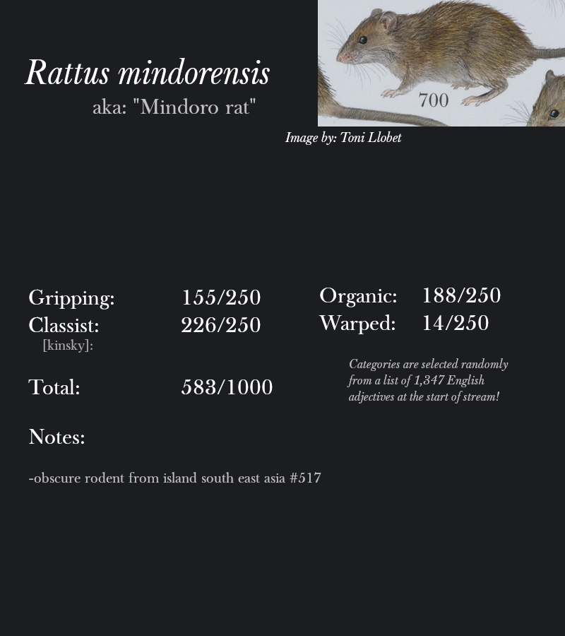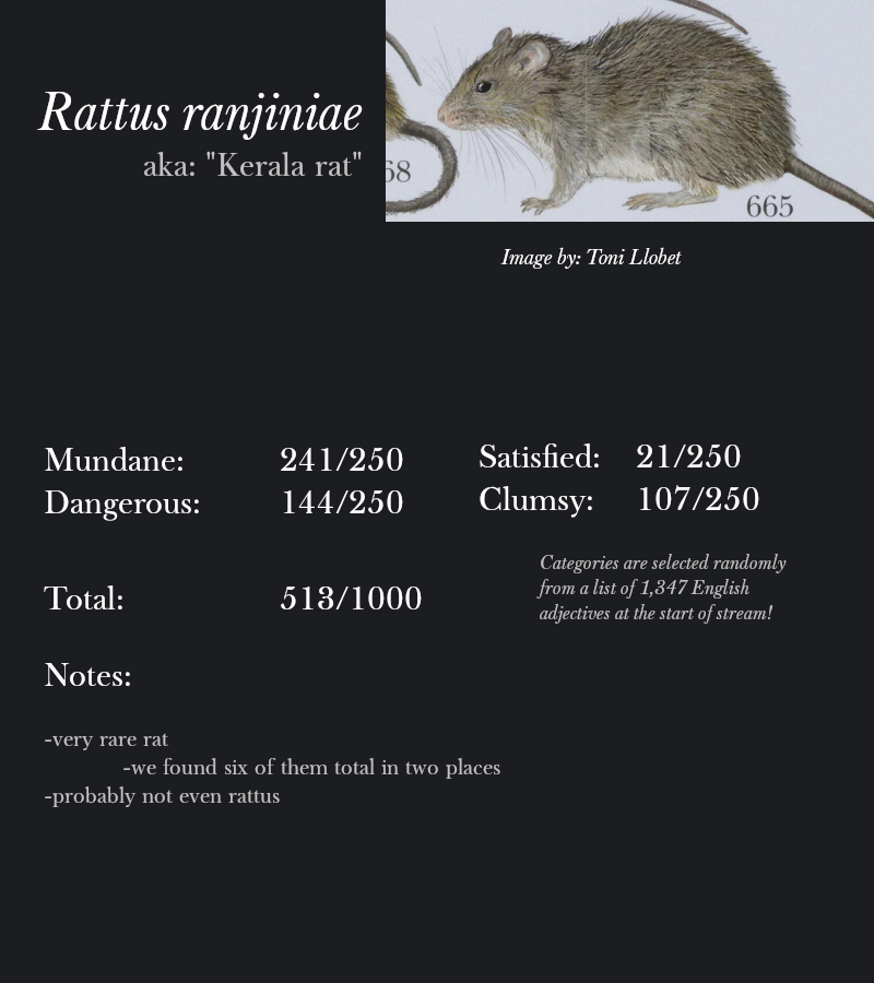 Categories are selected randomly from a list of 1,347 English adjectives at the start of stream! Rude: 182/250 Icy: 26/250 Image by: Liam Huber Notes:
