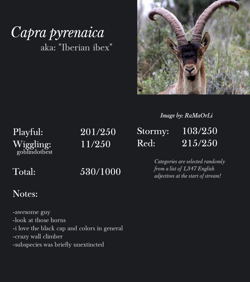 -awesome guy -look at those horns -i love the black cap and colors in general -crazy wall climber -subspecies was briefly unextincted Total: 530/1000 goblindotbest Playful: 201/250 Wiggling: 11/250