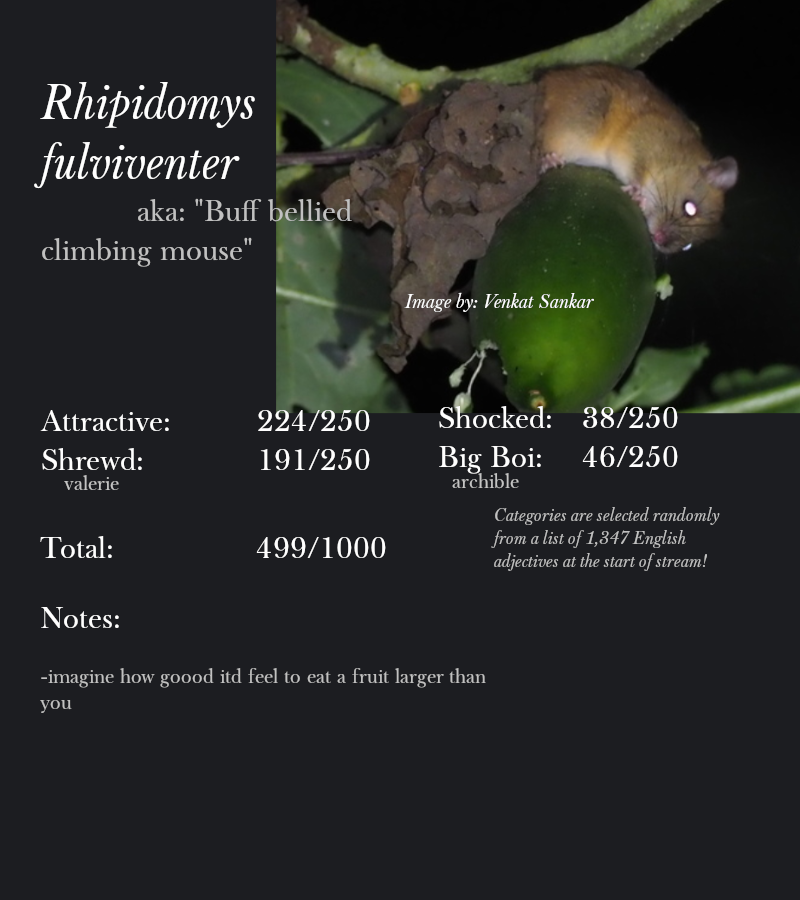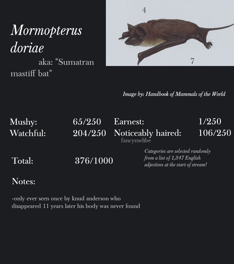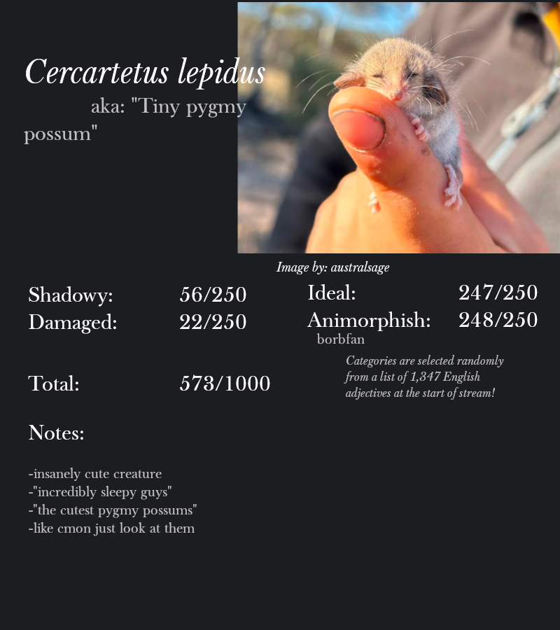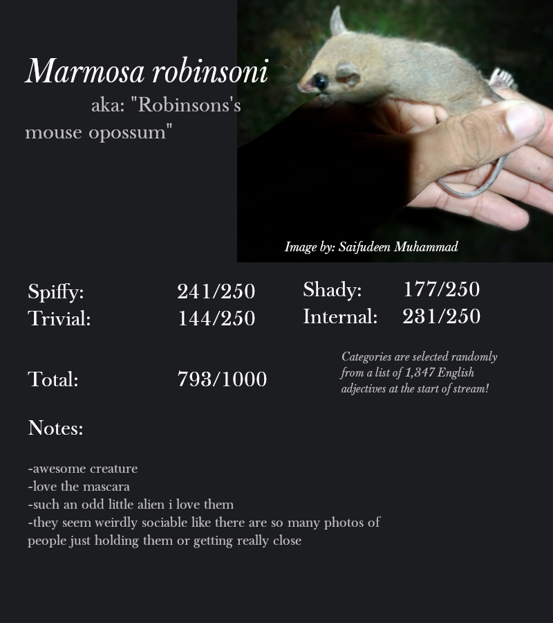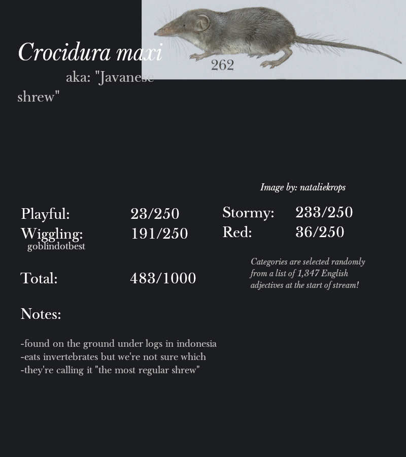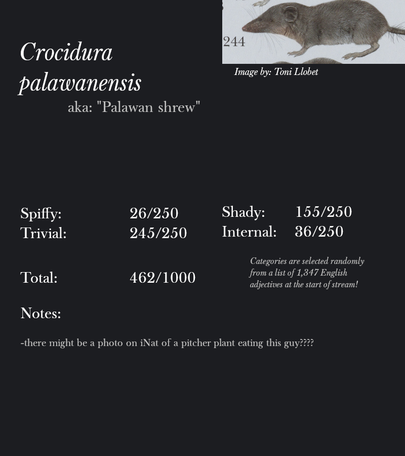 Suncus malayanus aka: "Malayan pygmy shrew" Image by: Utain Pummarin Cuddly: 49/250 Jittery: 235/250 Useful: 44/250 Winged: 102/250 Categories are selected randomly Total: 480/1000 âtec o he tr of reat Notes: -tinier!! -we're getting such small ones today -the smallest gust of wind would send this into space -they occur in montane forests enclosed by tea plantations -boardgame-ass habitat