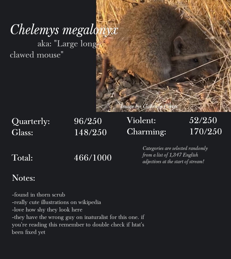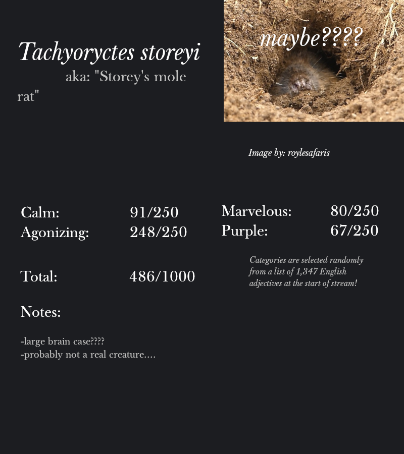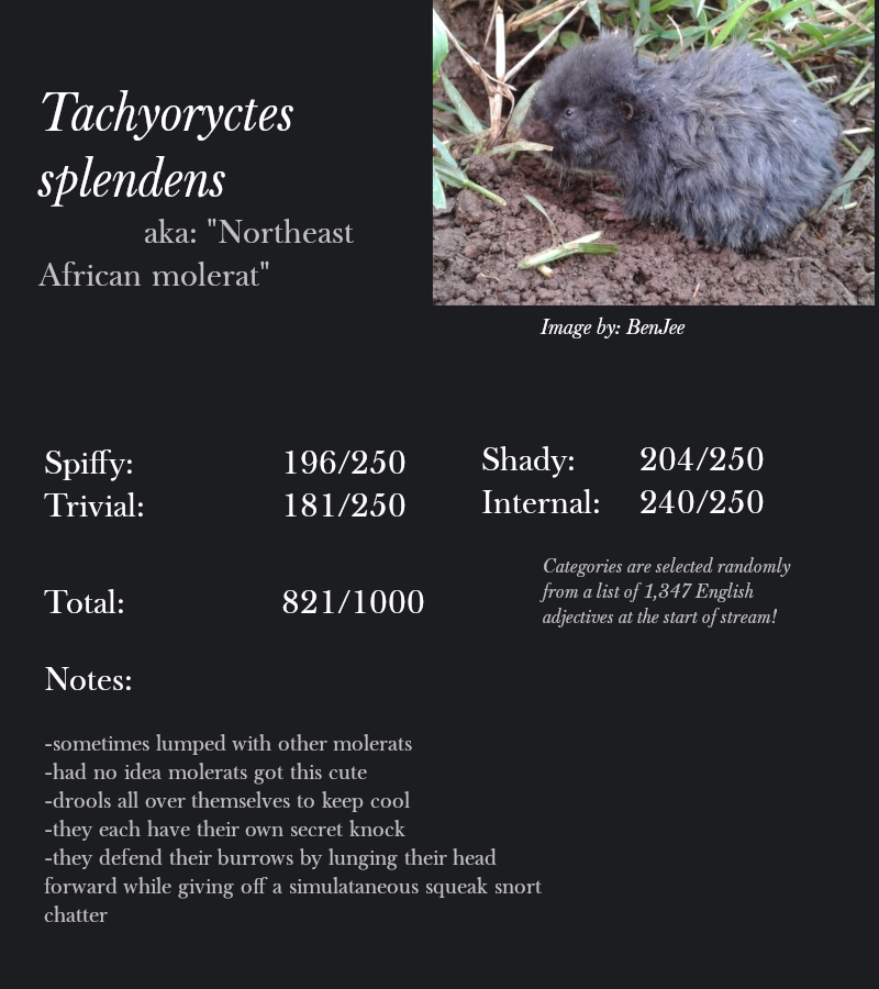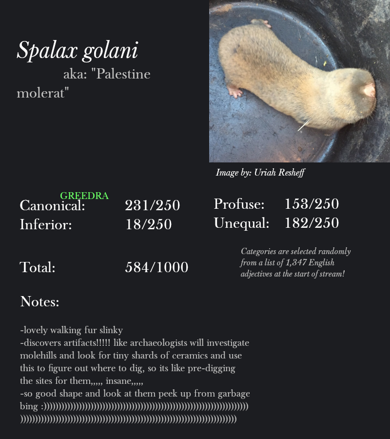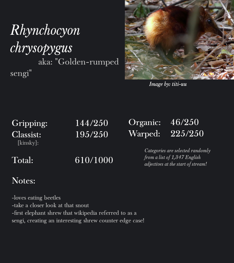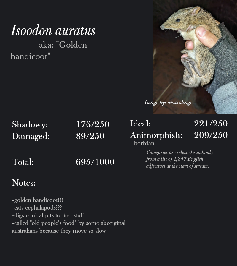 Neamblysomus gunning aka: "Gunning's golden mole" Unhealthy: 219/250 Normal: 40/250 Total: 594/1000 Notes: -persecuted by gardeners -i didnt know they made moles in this color -tiny -preyed on by cats and dogs -we gotta save this guy Image by: Vincent Egan Heavenly: 203/250 Unruly: 182/250 Categories froma list are of 1 selected ,347 Eng randomly glish Categ froma ies list are of e select 1,347 ed rando English adjectives at the start of stream!