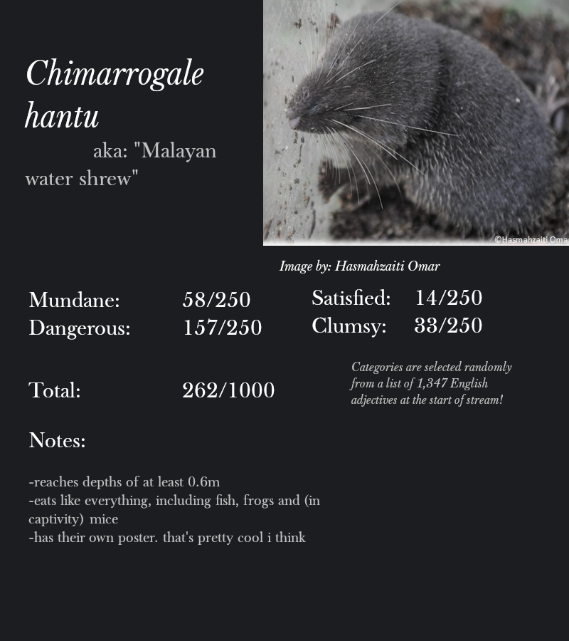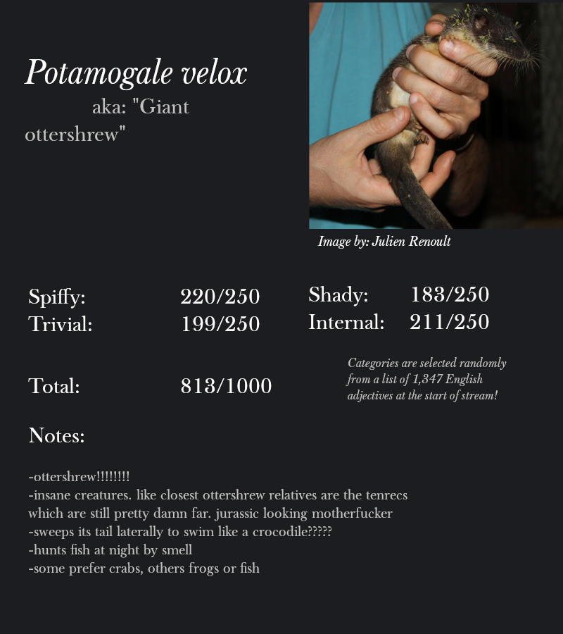 -ottershrew!!!!!!!! -insane creatures. like closest ottershrew relatives are the tenrecs which are still pretty damn far. jurassic looking motherfucker -sweeps its tail laterally to swim like a crocodile????? -hunts fish at night by smell -some prefer crabs, others frogs or fish Total: 813/1000 Spiffy: 220/250 Trivial: 199/250