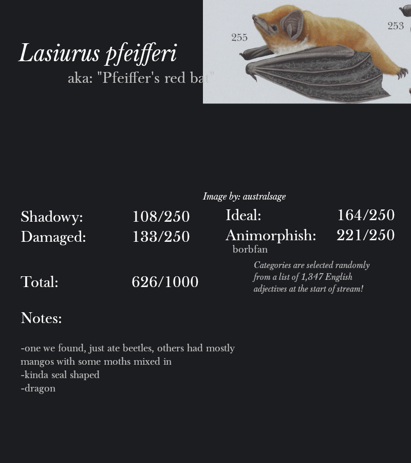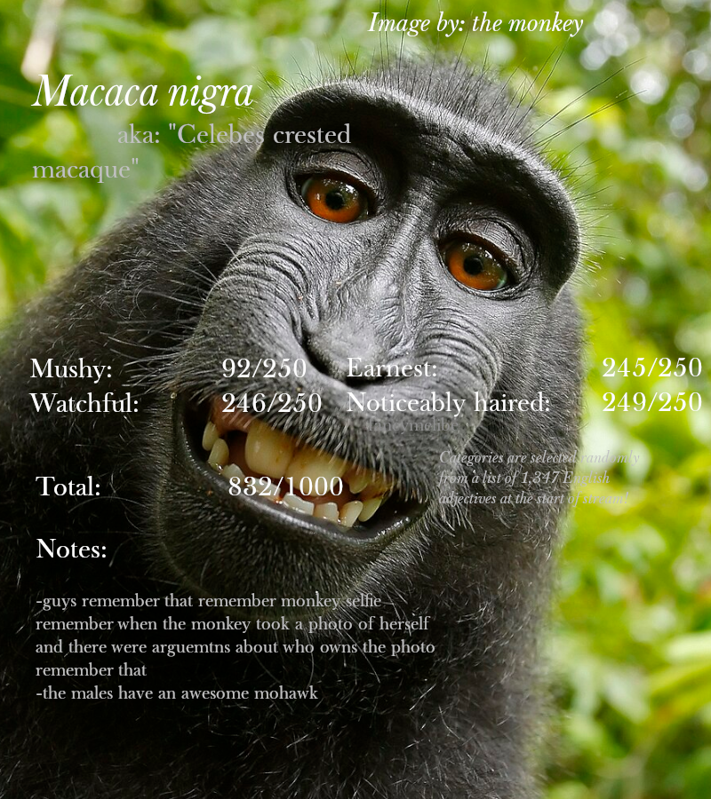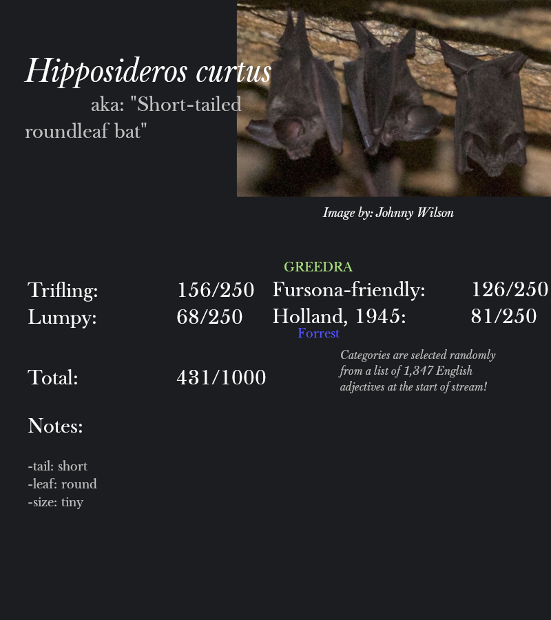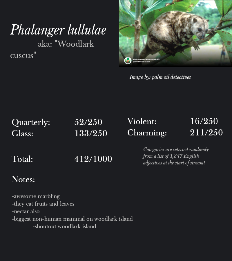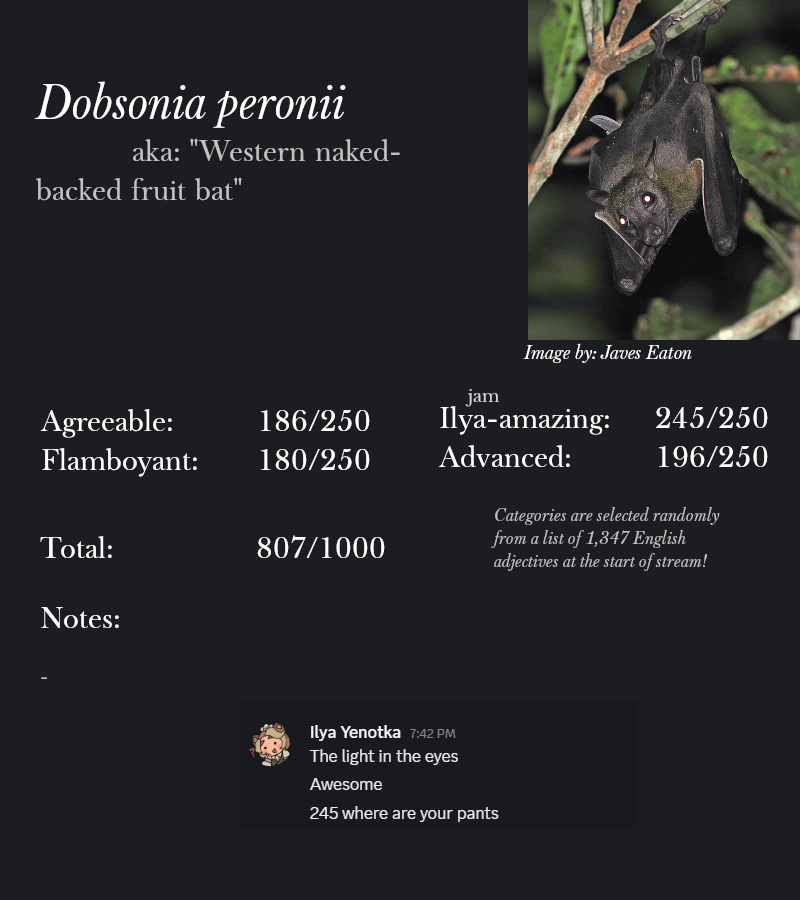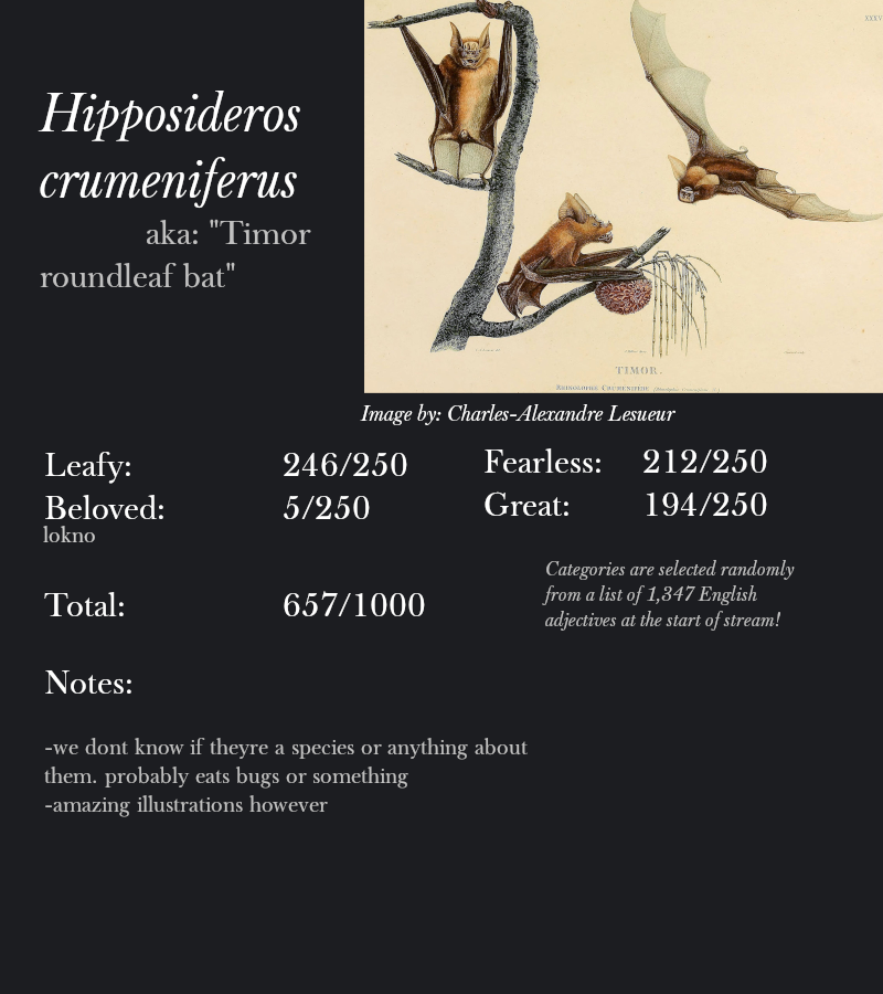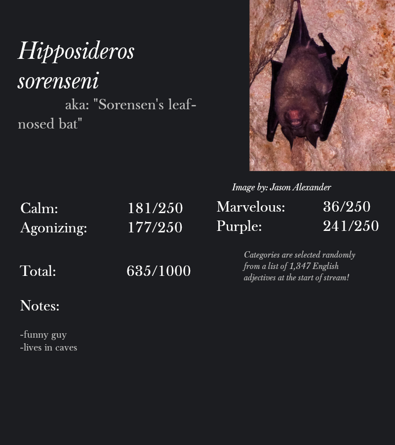 Categories are selected randomly from a list of 1,347 English adjectives at the start of stream! Shady: 183/250 Internal: 211/250 Image by: Julien Renoult Notes: