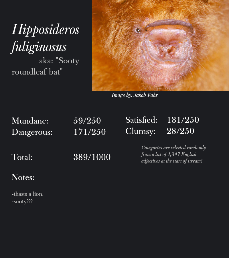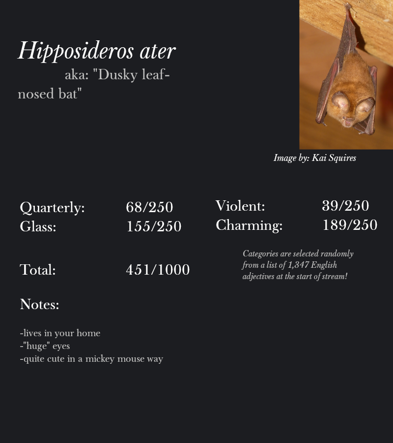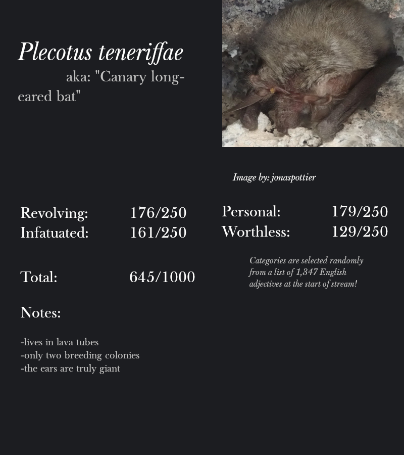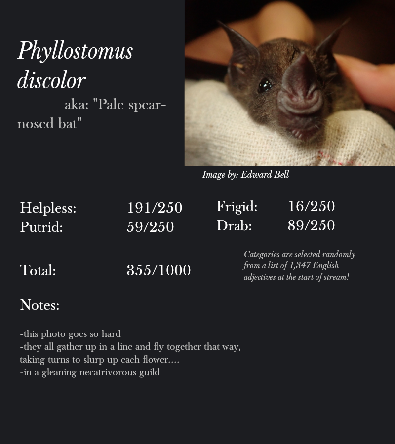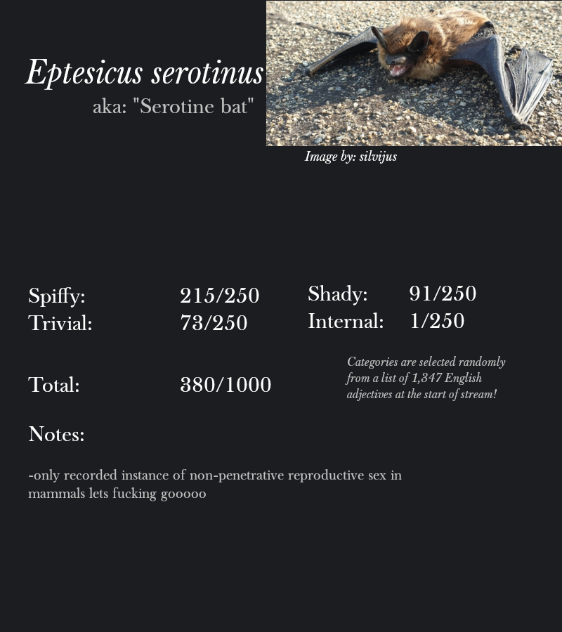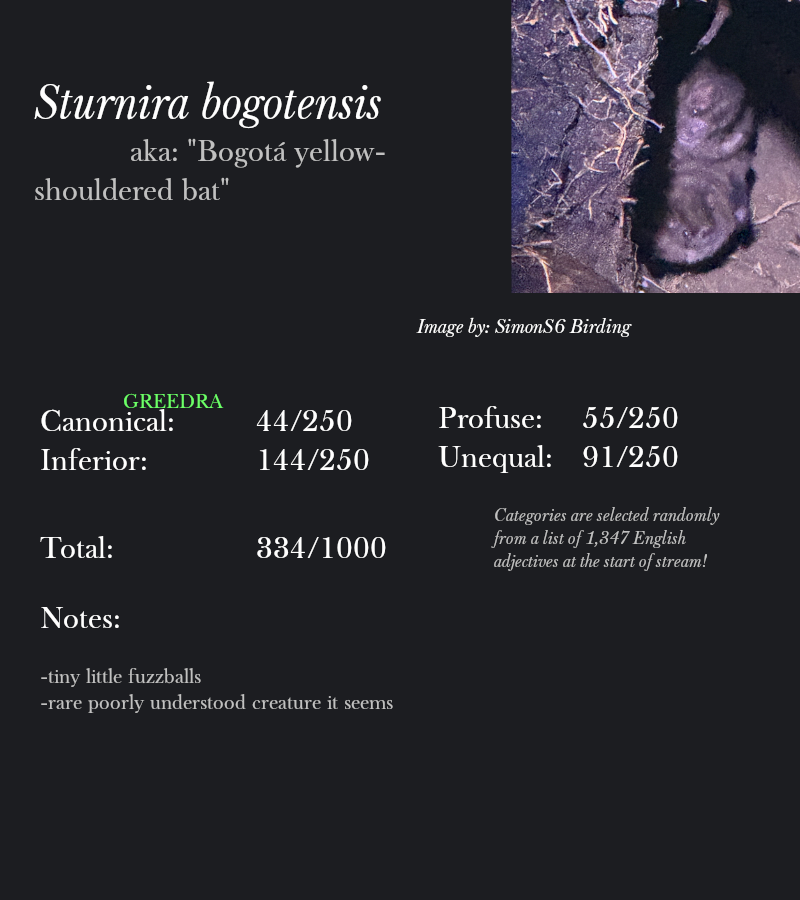Categories are selected randomly from a list of 1,347 English adjectives at the start of stream! Shady: 183/250 Internal: 211/250 Image by: Julien Renoult Notes:
