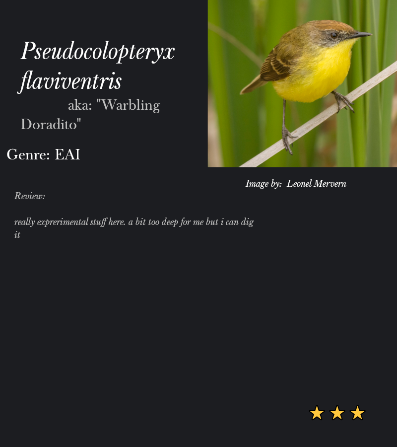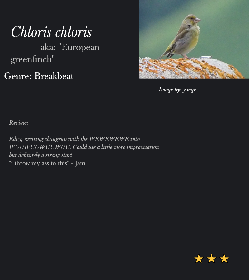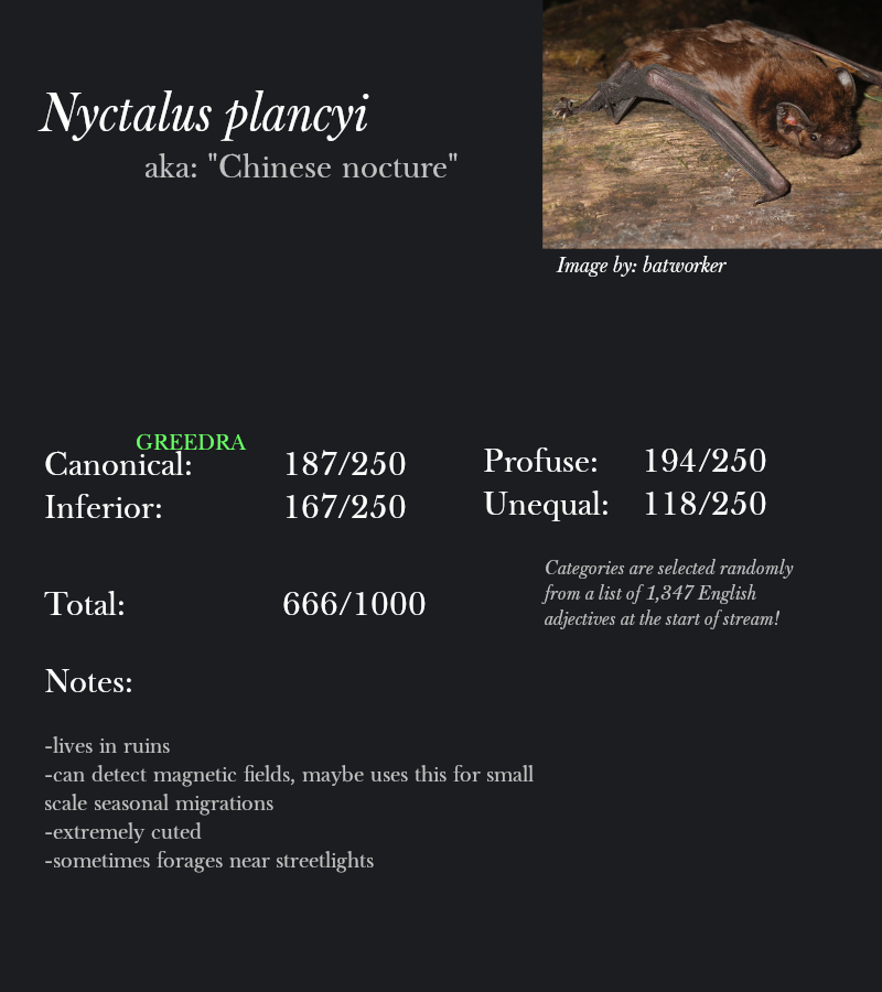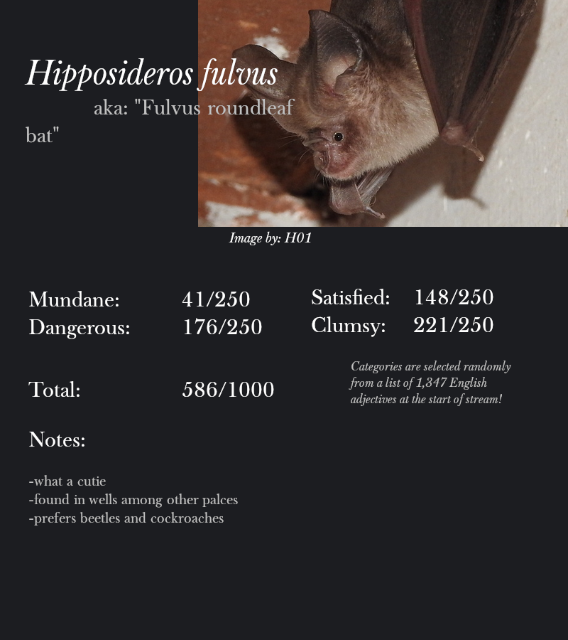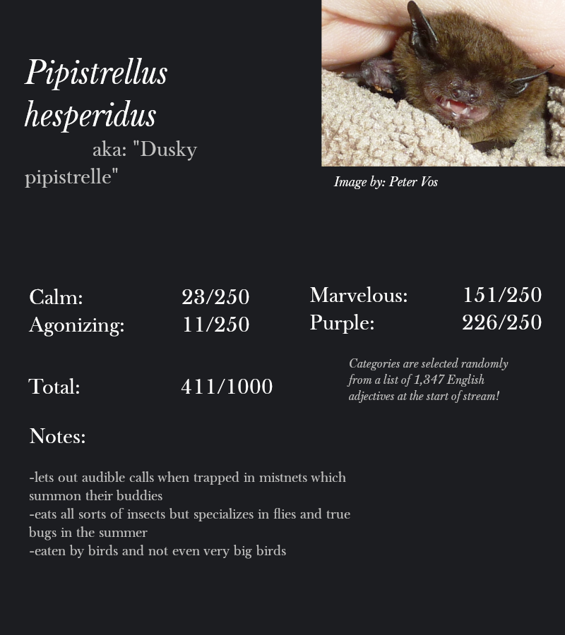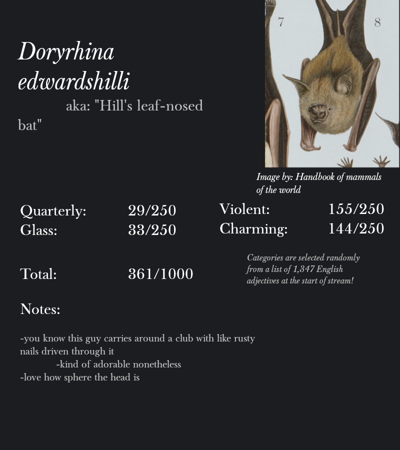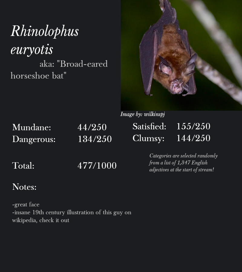 Categories are selected randomly from a list of 1,347 English adjectives at the start of stream! Shady: 183/250 Internal: 211/250 Image by: Julien Renoult Notes: