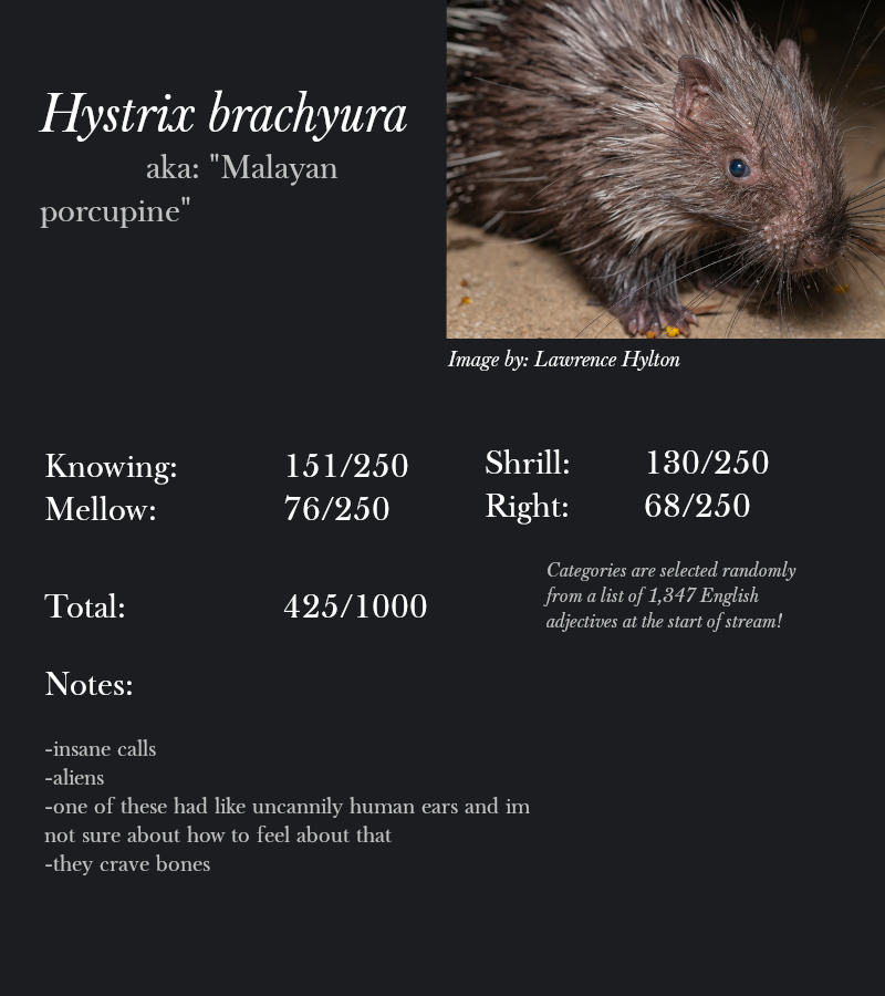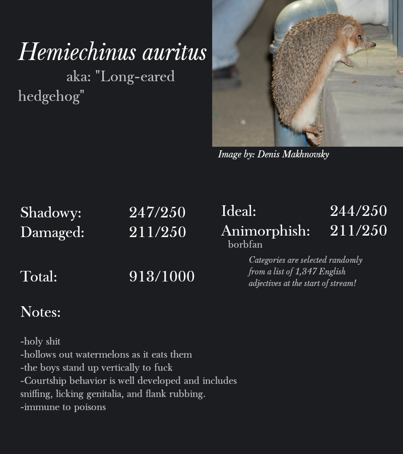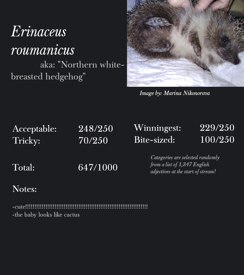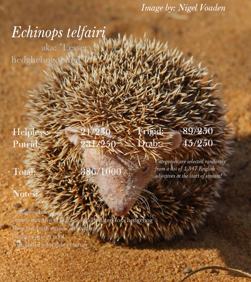 -insane sphere -crazy that this is like not at all related to a hedgehog they just both came out that way -tenrecs are so cool -delightful adorable creature Total: 386/1000 Helpless: 21/250 Putrid: 231/250