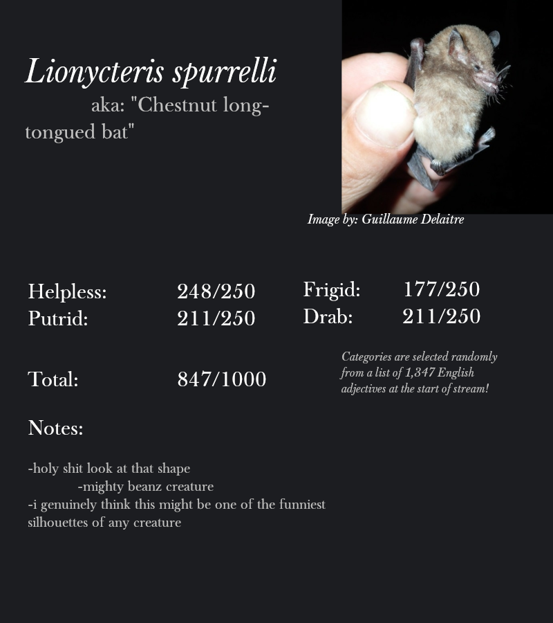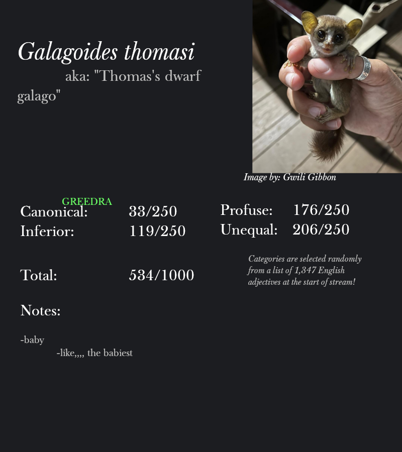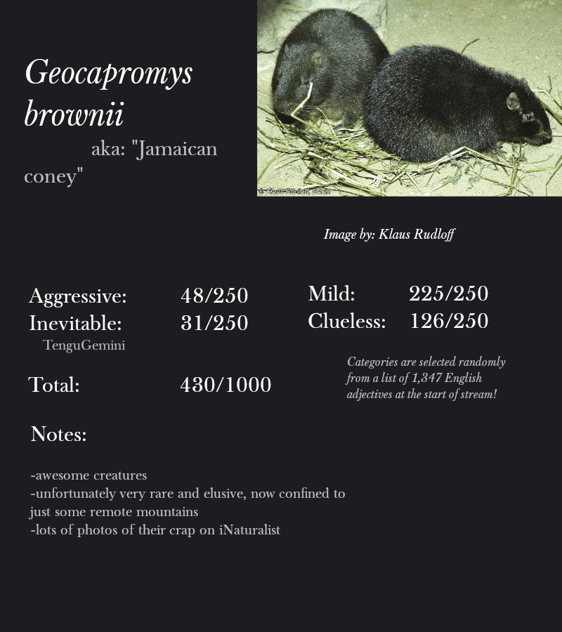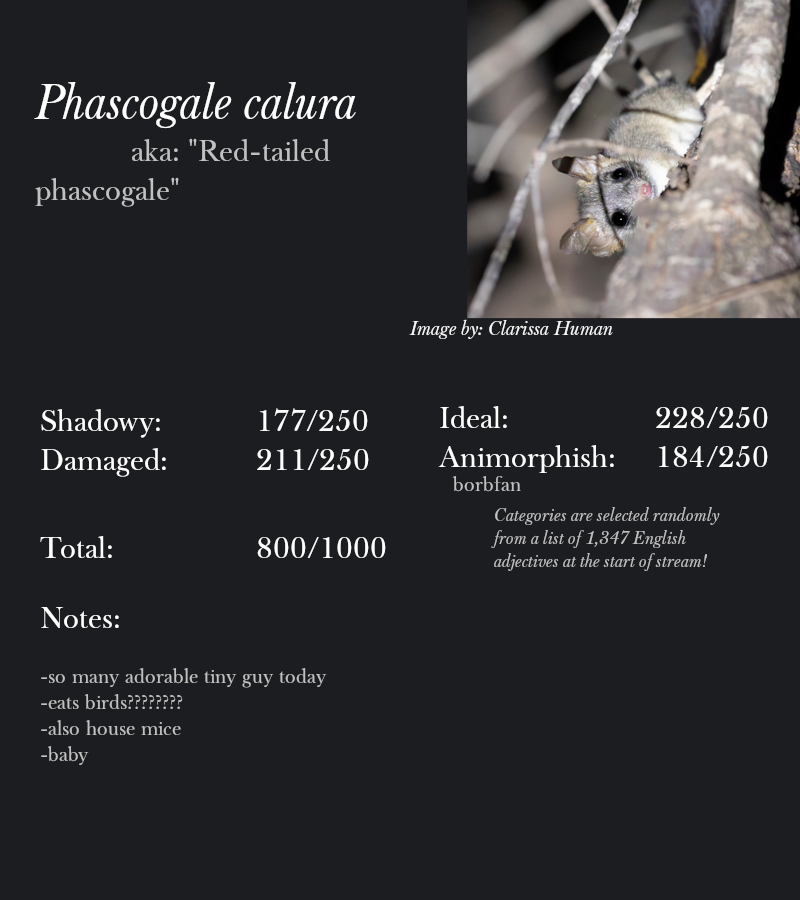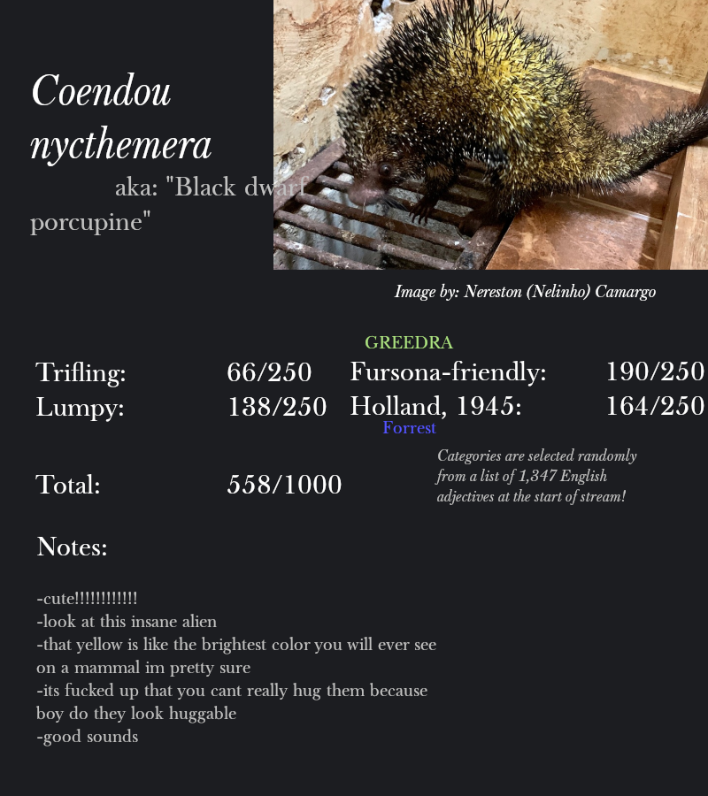 -insane sphere -crazy that this is like not at all related to a hedgehog they just both came out that way -tenrecs are so cool -delightful adorable creature Total: 386/1000 Helpless: 21/250 Putrid: 231/250