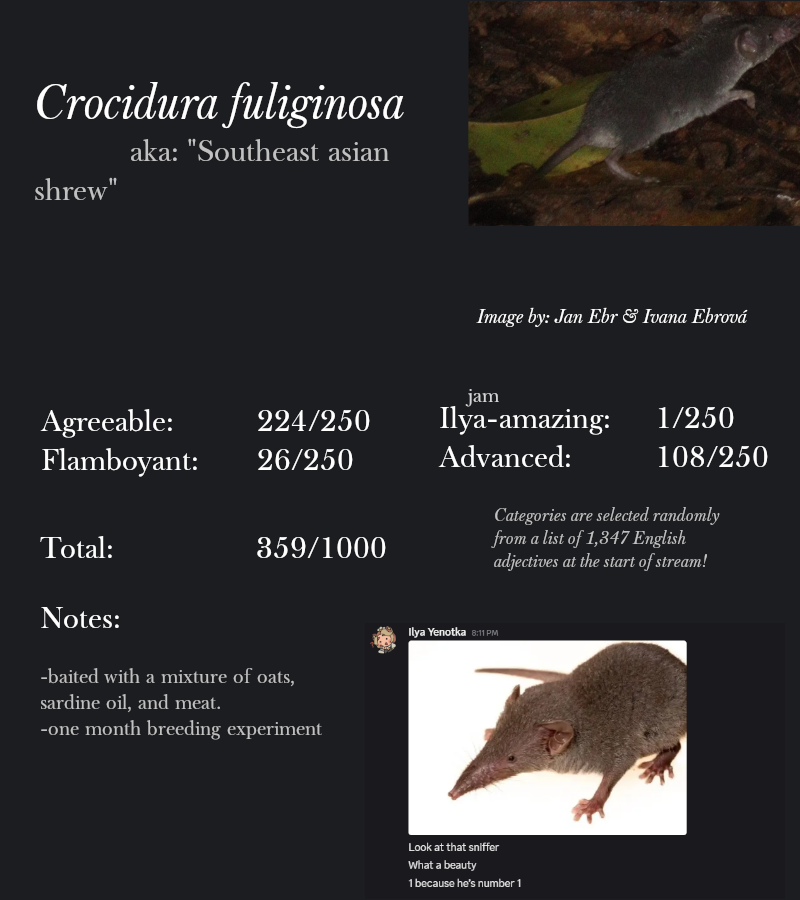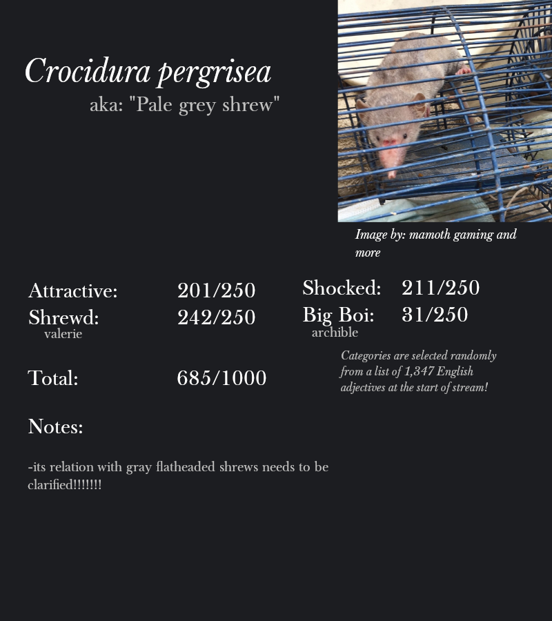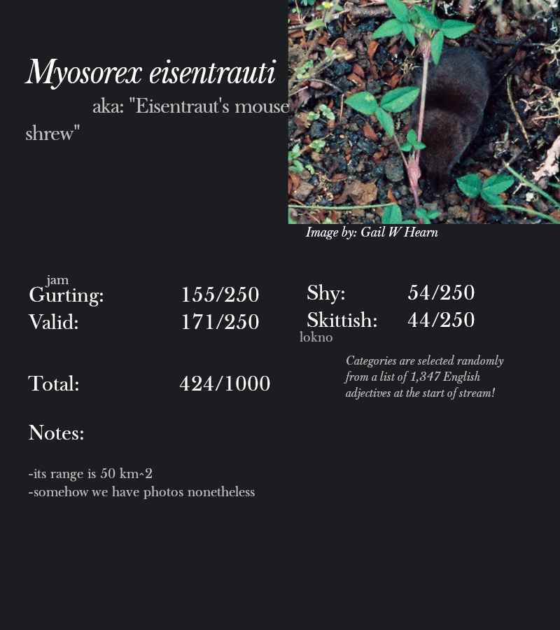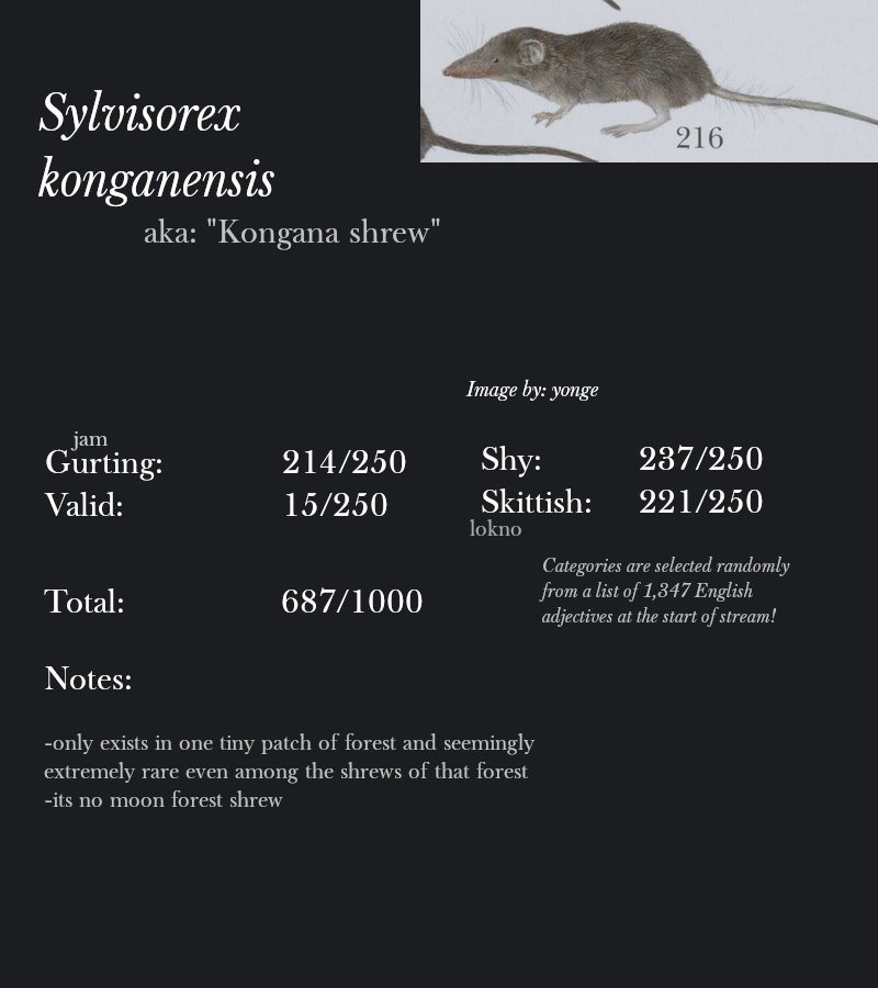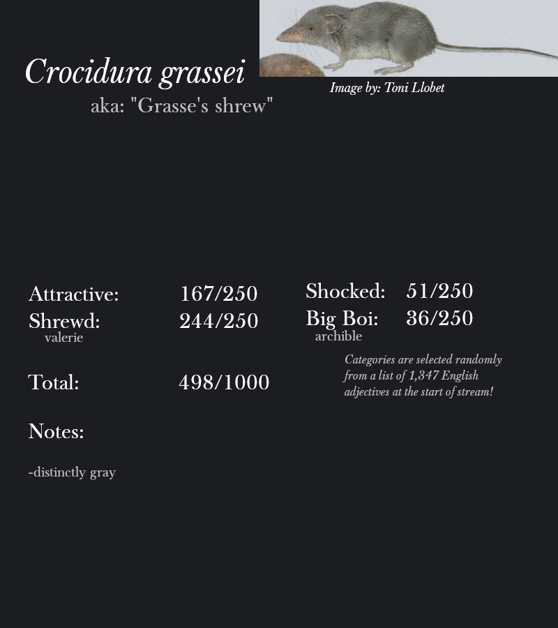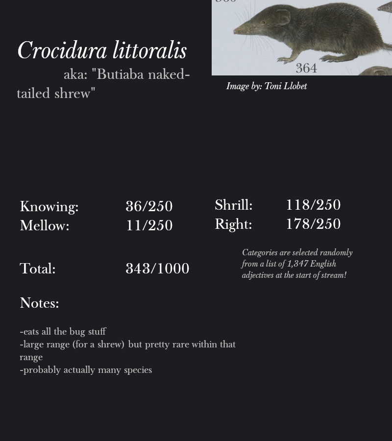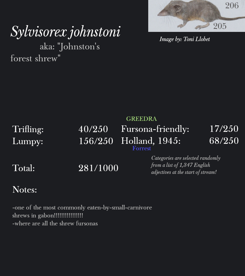-one of the most commonly eaten-by-small-carnivore shrews in gabon!!!!!!!!!!!!!!!! -where are all the shrew fursonas Total: 281/1000 Trifling: 40/250 Lumpy: 156/250