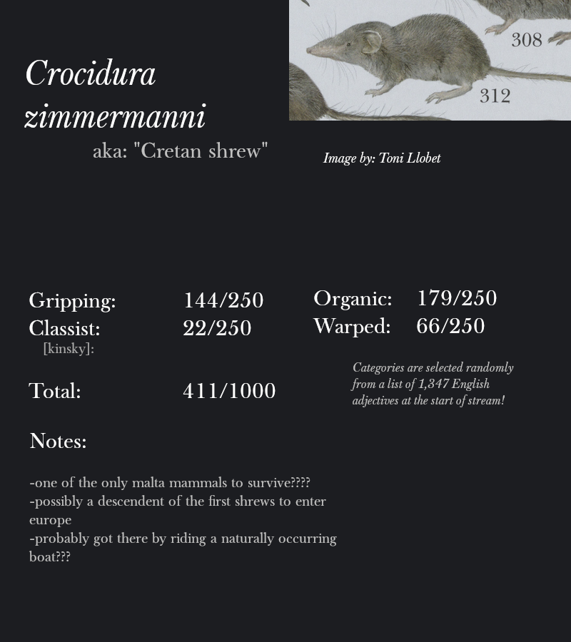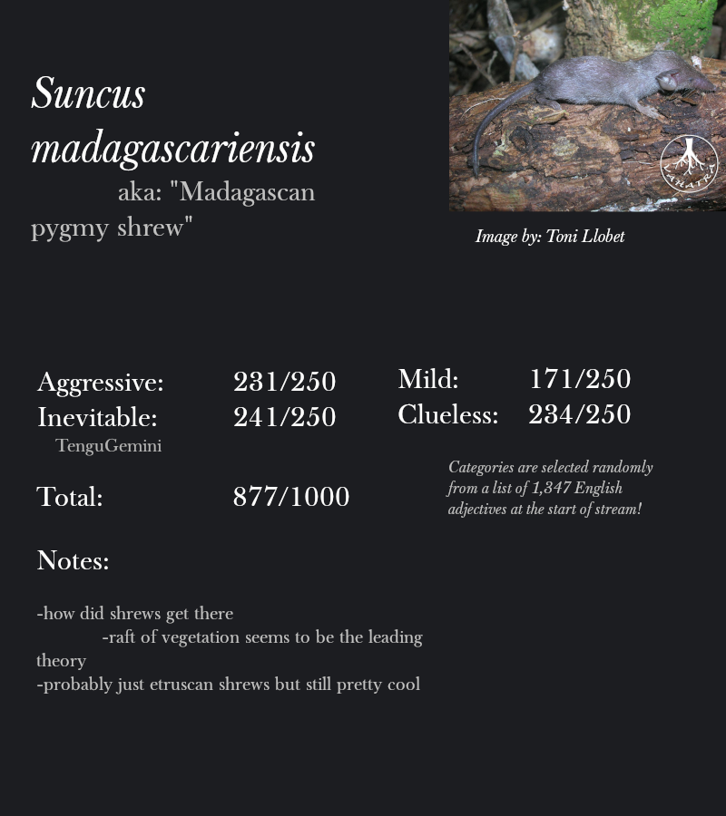 -how did shrews get there -raft of vegetation seems to be the leading theory -probably just etruscan shrews but still pretty cool Total: 877/1000 Aggressive: 231/250 Inevitable: 241/250