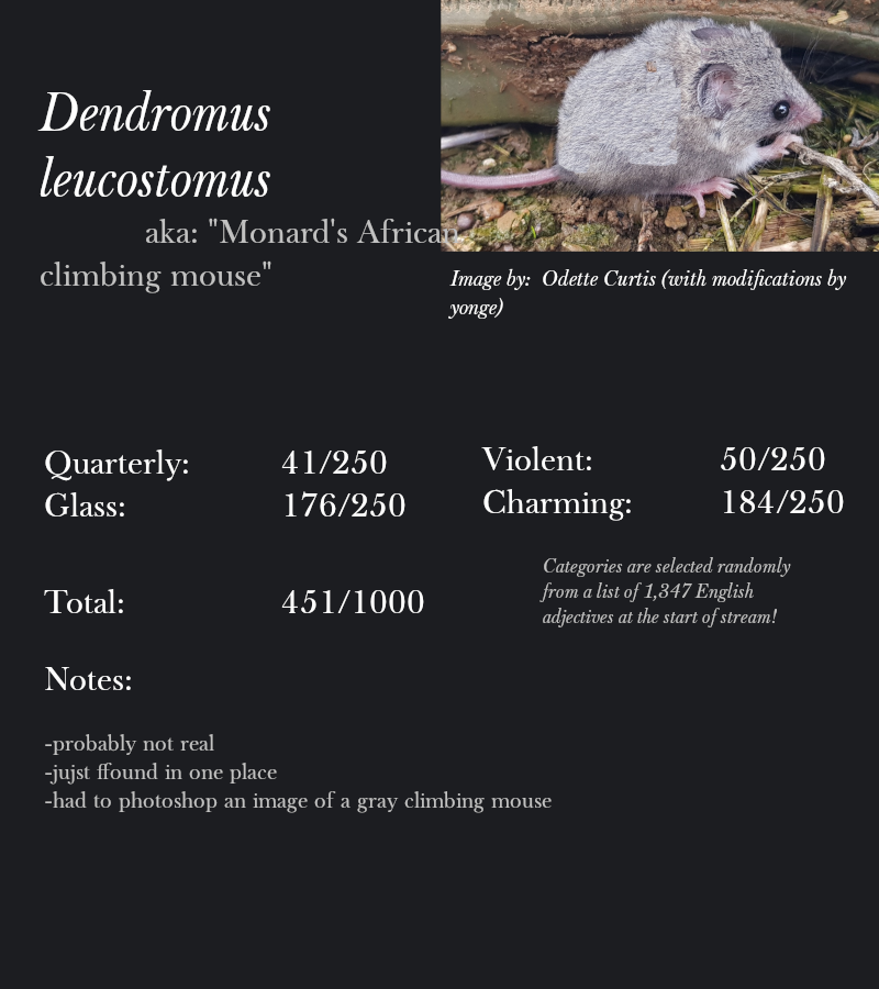 -moon forest shrew!!!! -its kind of lame that its parsed moon (forest shrew) and not (moon forest) shrew -i really want to imagine a moon forest ok..... -ok so we did like an investigation and there were these mythical "moon mountains' whihc were thought to be the source of the nile or something and they found this shrew on that expedition so presumably that must be why Total: 667/1000 fancymelibe Dependent: 205/250 Seasonally appropriate:16/250