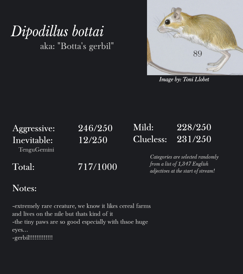 Categories are selected randomly from a list of 1,347 English adjectives at the start of stream! Mild: 171/250 Clueless: 234/250 Image by: Toni Llobet TenguGemini Notes:
