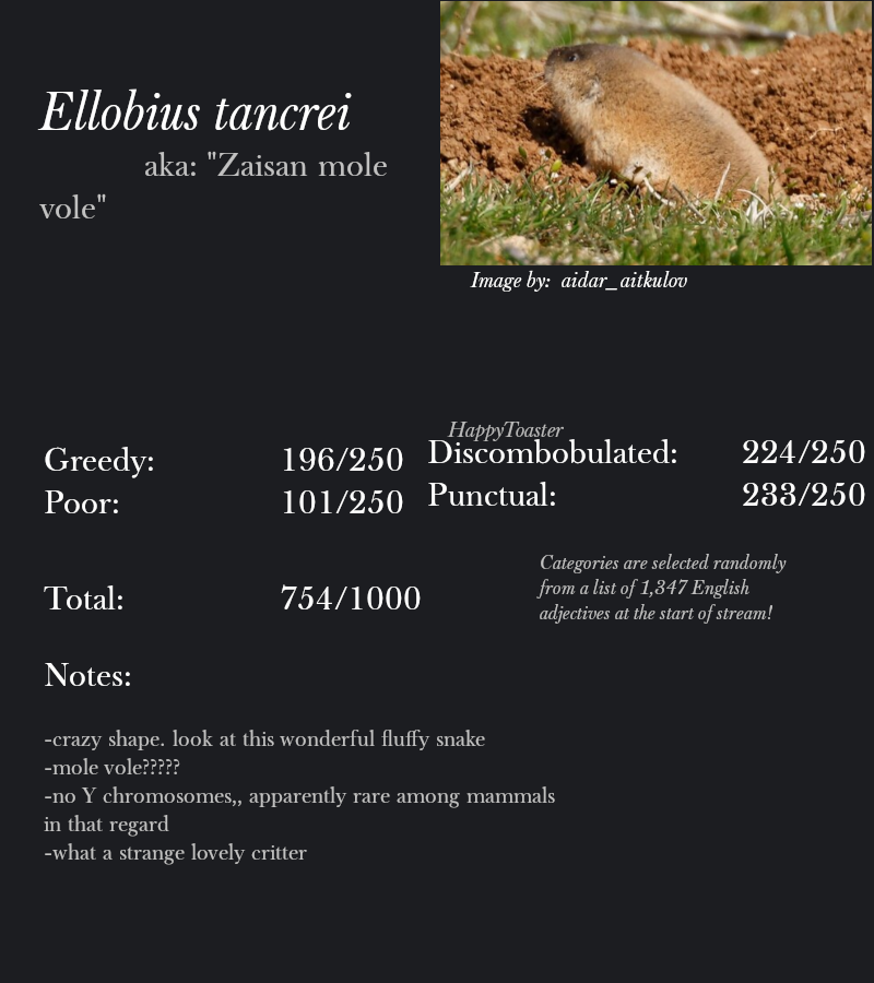 Mogera insularis aka: "Insular mole" Image by: sheng-hua Cooperative: 79/250 Serene: 148/250 Supercalifragilisticexpialidocious: 174/250 Flippant: 149/250 Categories from a list are of 1 selected ,347 Eng randomly glish Total: 550/1000 Categ from or a ies list ar of select 1,347 ed rando English adjectives at the start of stream! Notes: -classic mole -moles are so cool -lives in abandoned cultivated fields -obscure mole