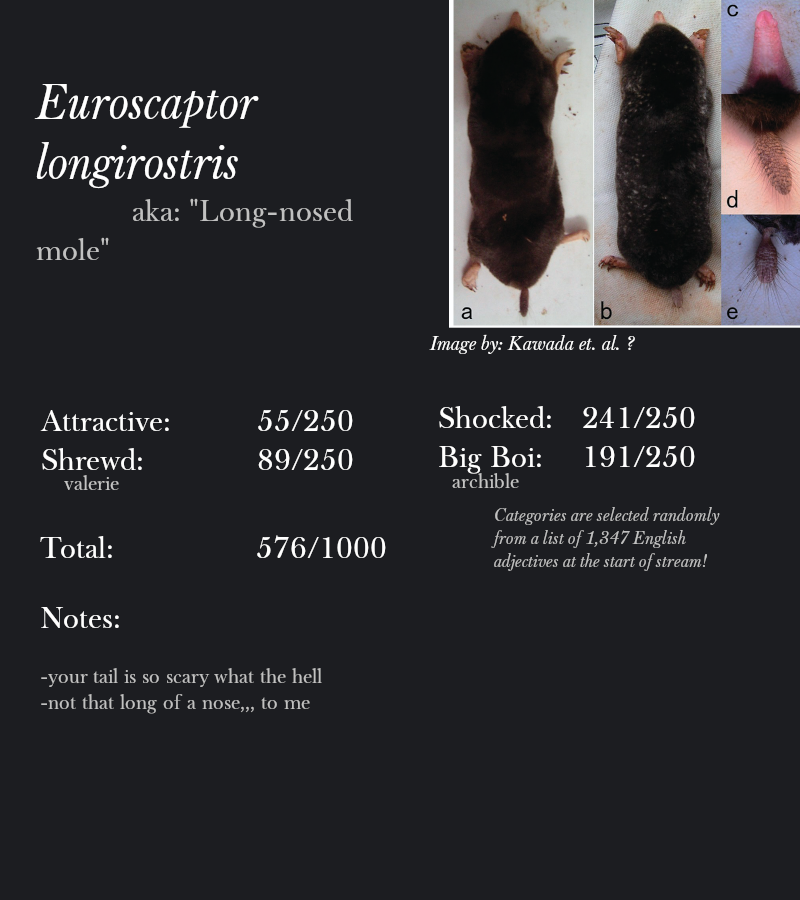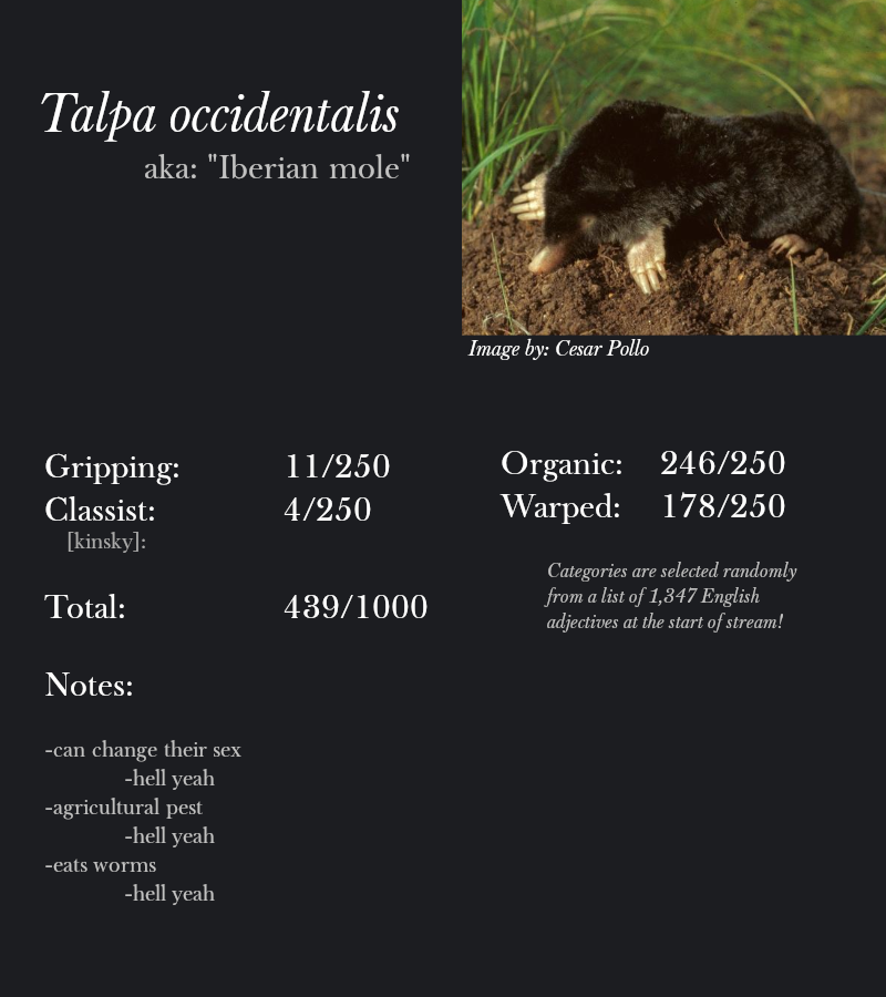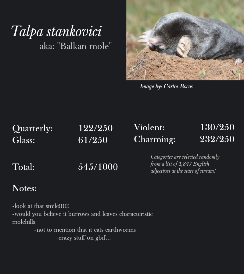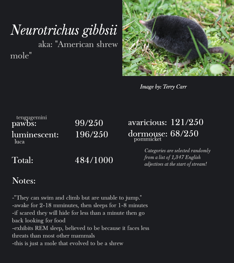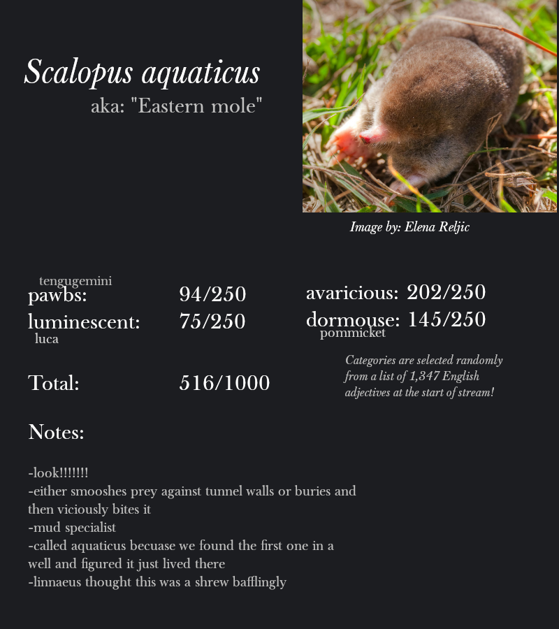 Talpa europaea aka: "Common mole" Image by: Marc Faucher Evergreen: 240/250 Neighboring: 195/250 Liquid: 215/250 Pastel: 204/250 Categories from a list are of 1 selected ,347 Eng randomly glish Total: 854/1000 Categ from or a ries list ar of select 1,347 ed rando English adjectives at the start of stream! Notes: -verified "non cuddly" -(strong disagree) -the great spotted woodpecker is cuddly??? -this is it. default european mole. crazy -moles are wild -they get kicked out of mom's house as teens and are forced to carve out a life of their own