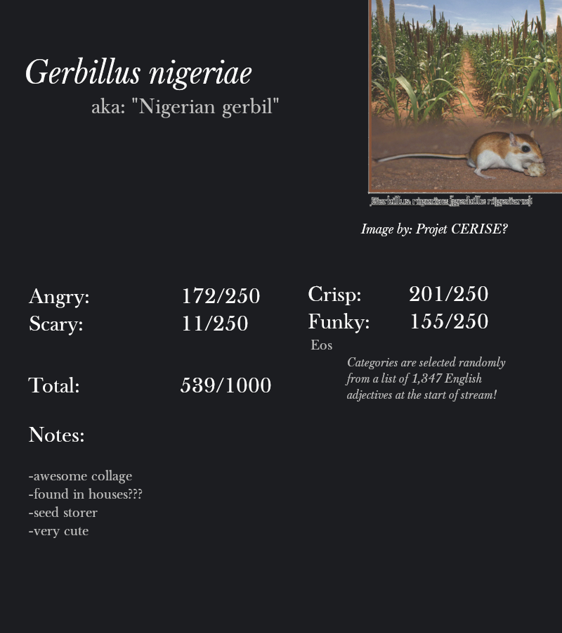 Categories are selected randomly from a list of 1,347 English adjectives at the start of stream! Eos Crisp: 241/250 Funky: 206/250 Image by: markster2000 Notes: