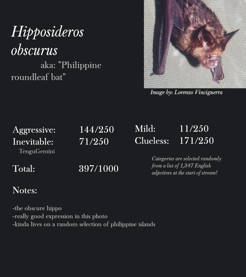 Categories are selected randomly from a list of 1,347 English adjectives at the start of stream! Mild: 51/250 Clueless: 63/250 Image by: bureaubenjamin TenguGemini Notes: