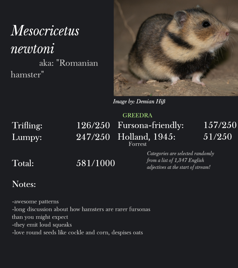 Categories are selected randomly from a list of 1,347 English adjectives at the start of stream! GREEDRA Forrest Fursona-friendly: 17/250 Holland, 1945: 68/250 Image by: Toni Llobet Notes: