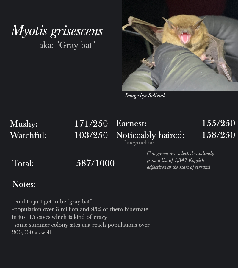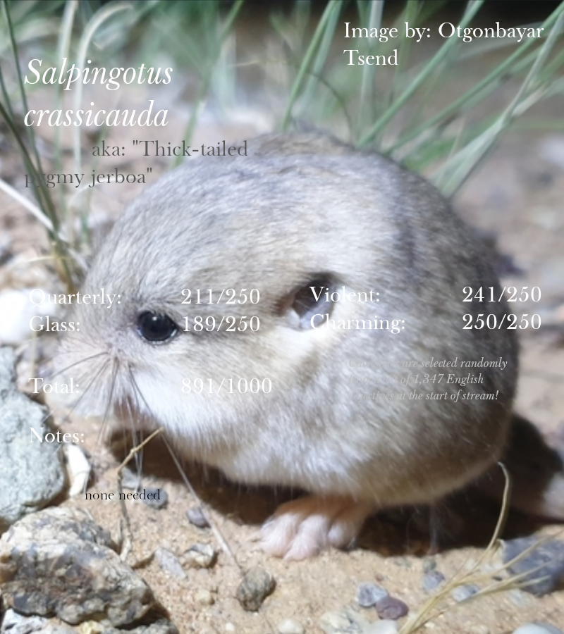 -weighs noticeably less than a US penny -it went from like IUCN critically endangered to IUCN least concern in a few years bafflingly -"possibly overhunted" Total: 531/1000 Fresh: 151/250 Tubby: 70/250