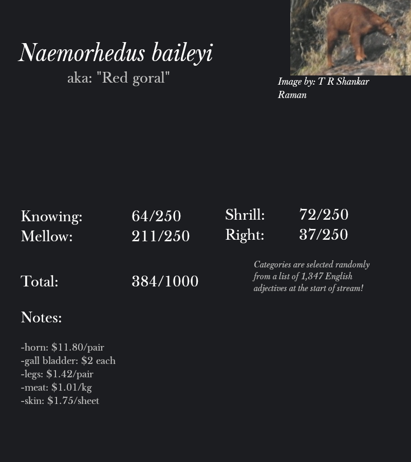 Capra walie aka: "Walia ibex" Sure-footed: 246/250 Overjoyed: 71/250 Bite-sized: 45/250 Hairy 210/250 Categories âfrom a list are of 1 selected ,347 Eng randomly glish Total: 572/1000 Categ âfrom or a ies list ar of select 1,347 ed rando English adjectives at the start of stream! Notes: -distinguished beards -im sorry but like how are you getting threatened by domestic its a fuck goats ing ib cmon ex!!! man dome its es a tic goats fucking cmon ibex!!! -not a mouse or a bat!! an ibex! -really pretty horns but only for show