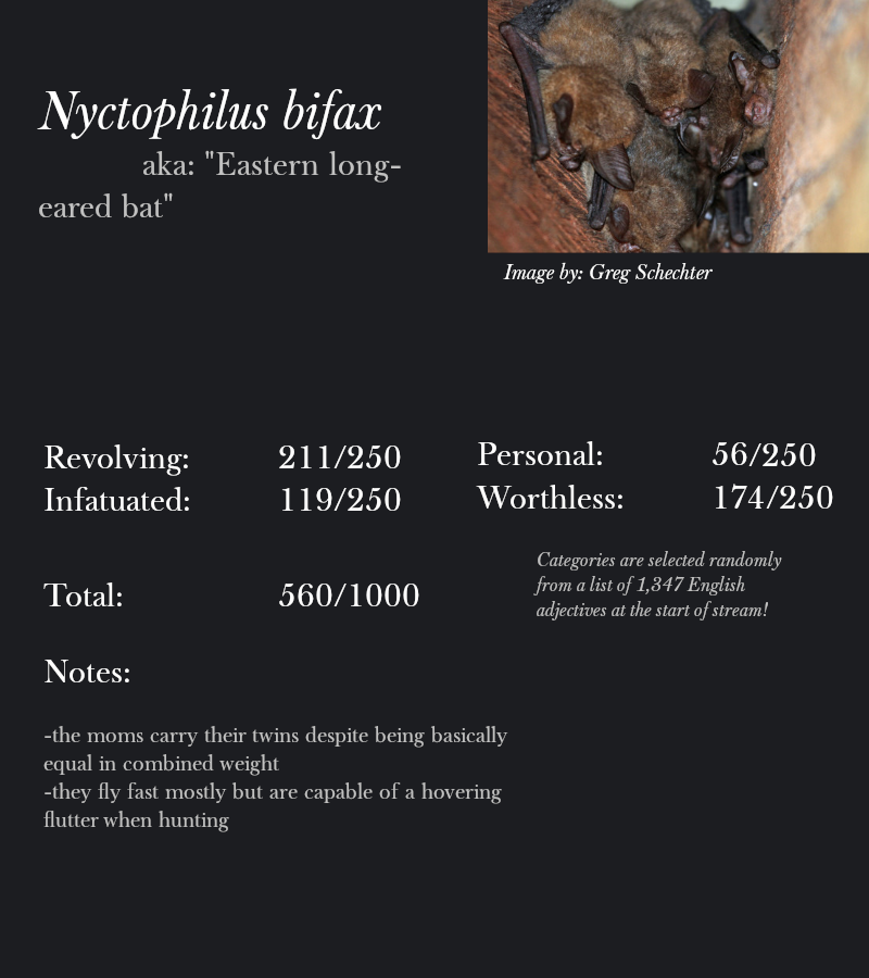 -awesome ears -this guys on a poster in my room -"seem to be somewhat resilient" Total: 619/1000 Nervous: 191/250 Nutty: 97/250