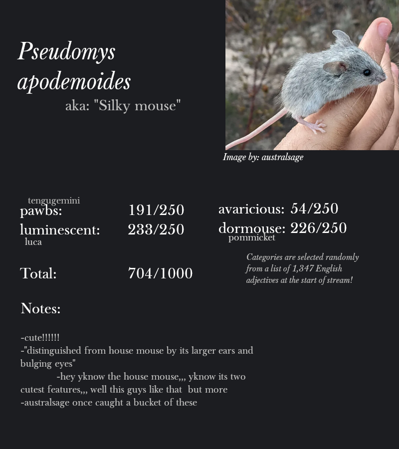 pommicket Categories are selected randomly from a list of 1,347 English adjectives at the start of stream! avaricious: 202/250 dormouse: 145/250 Image by: Elena Reljic Notes:
