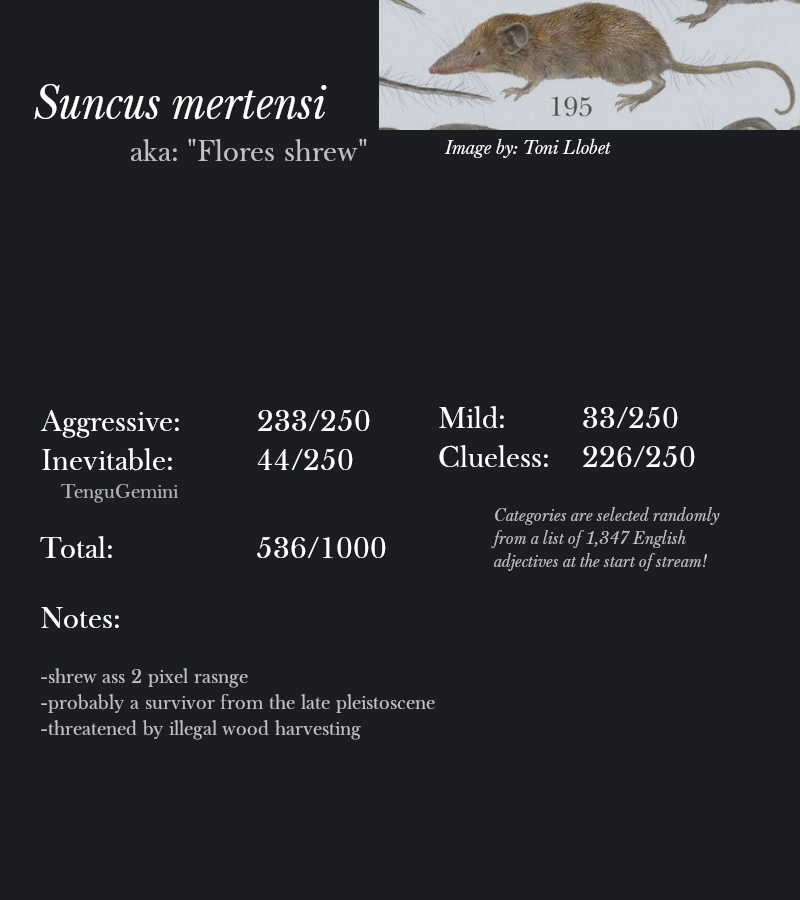-shrew ass 2 pixel rasnge -probably a survivor from the late pleistoscene -threatened by illegal wood harvesting Total: 536/1000 Aggressive: 233/250 Inevitable: 44/250